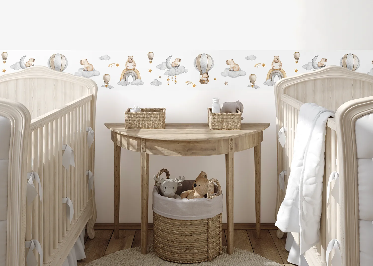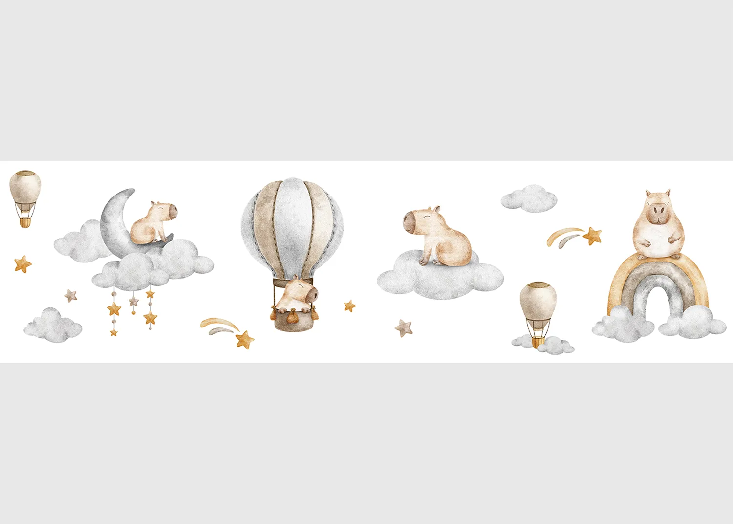Rozjasněte pokoj svého dítěte s našimi bordurami na zed‘ Roztomilá Akvarelová Kapybara. Bordury jsou vytvořeny tak, aby do každého prostoru vnesly kromě nádechu hravosti také teplo a radost.