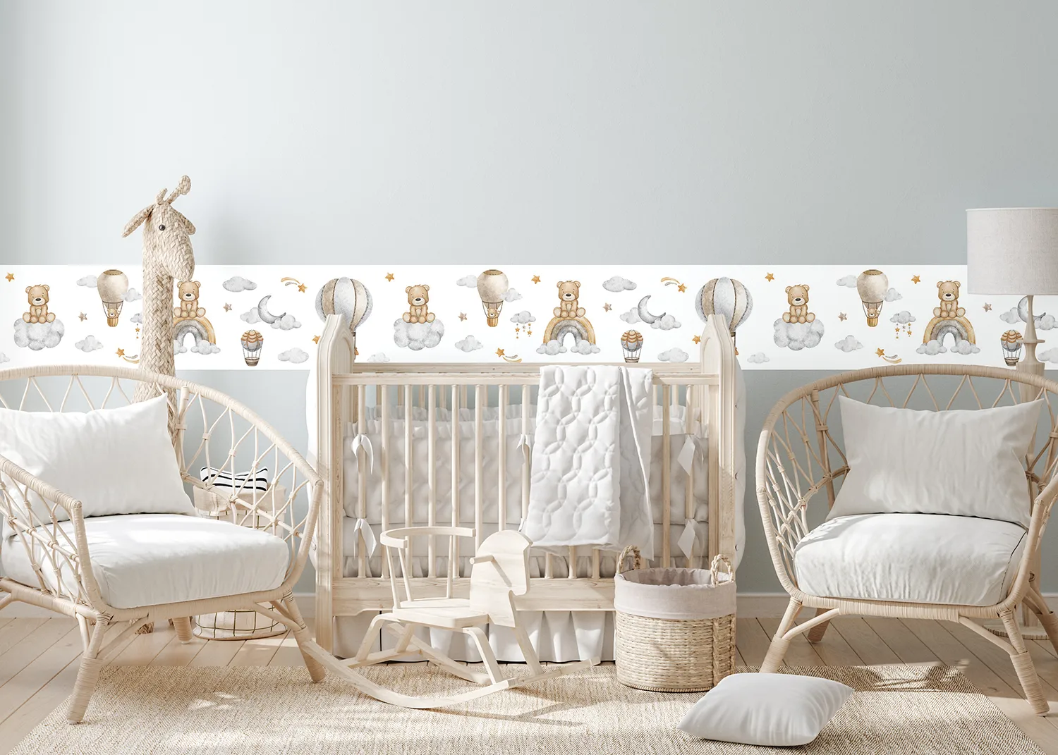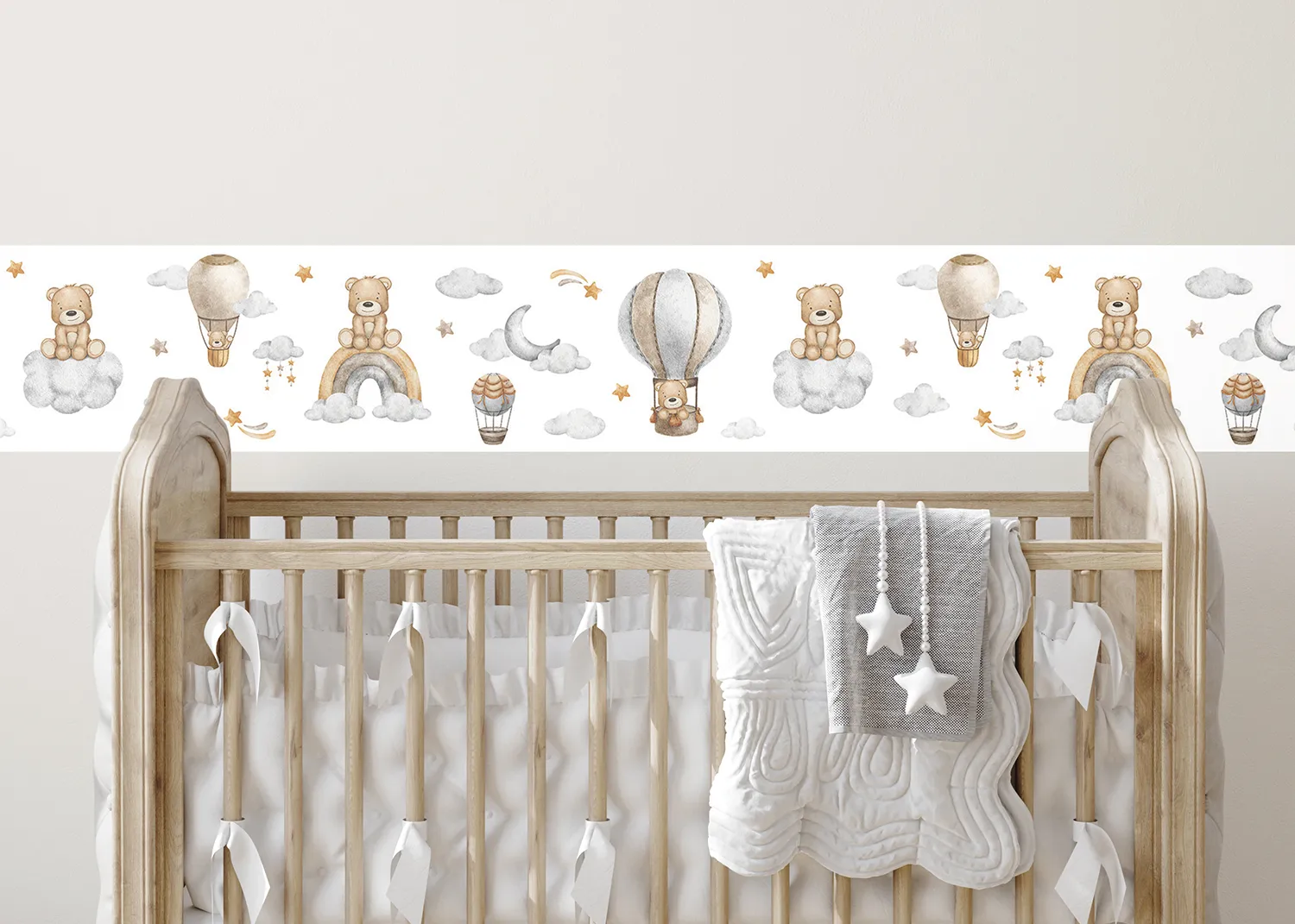 Rozjasněte pokoj svého dítěte s našimi bordurami na zed‘ Roztomilý Medvídek na Obloze na Bílé. Bordury jsou vytvořeny tak, aby do každého prostoru vnesly kromě nádechu hravosti také teplo a radost.