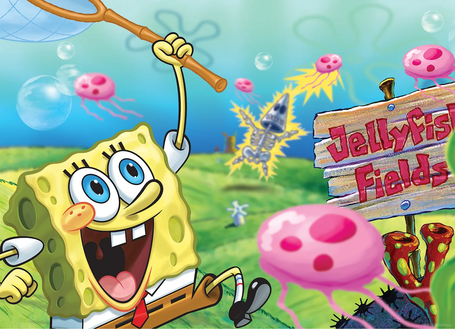 Dětská vliesová fototapeta na zed‘ Spongebob Chytá Medúzy | 252 x 182 cm | DFTDXL2053