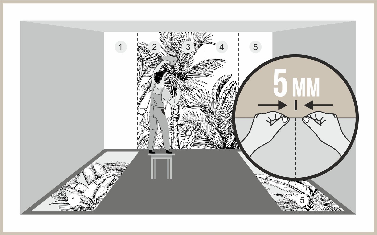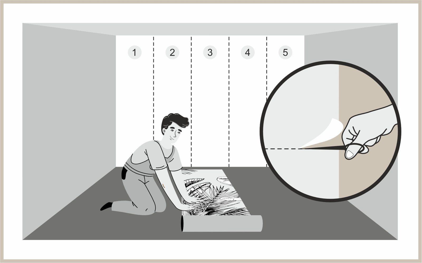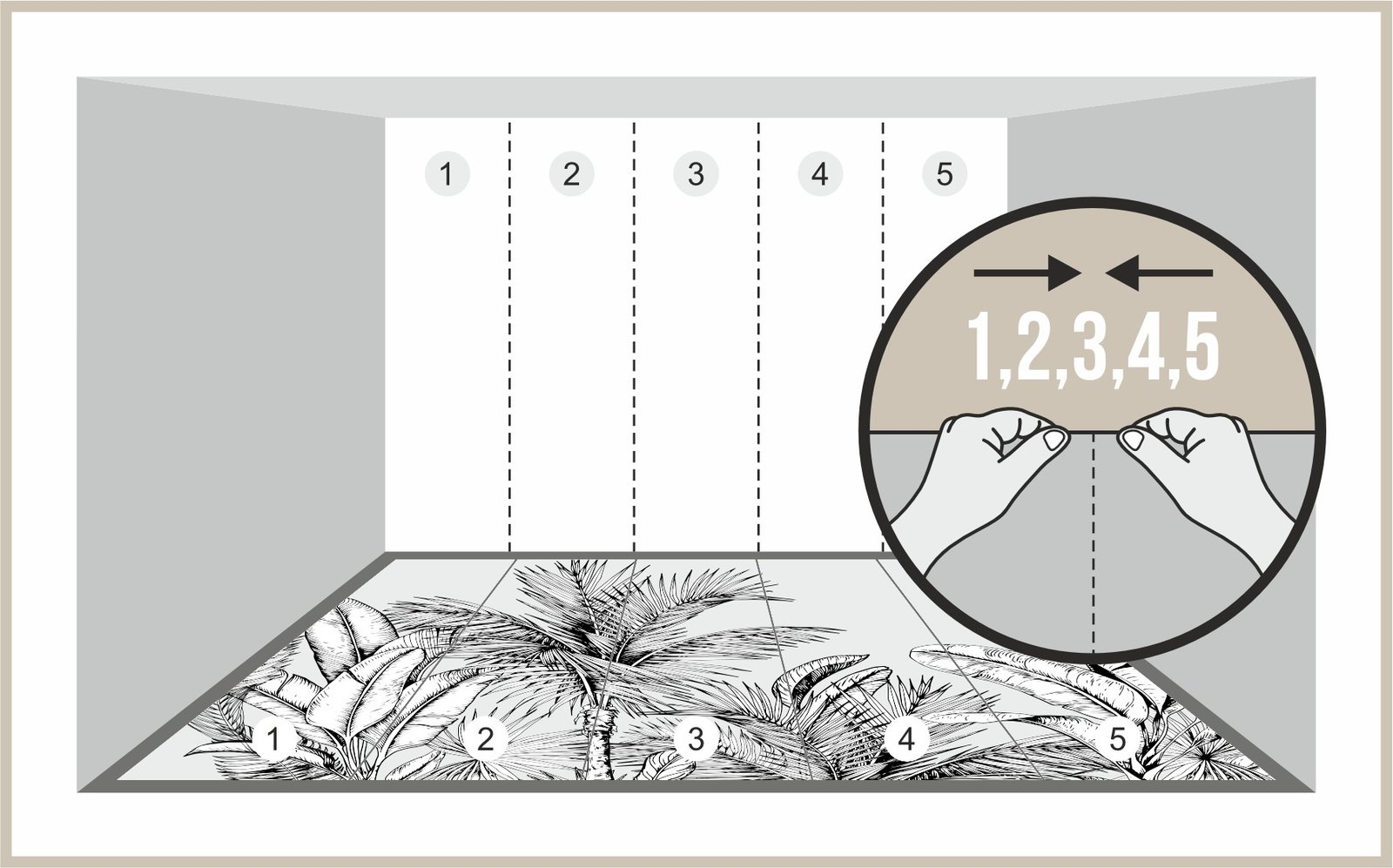 Před nalepením si rozložte jednotlivé panely na čistou podlahu nebo na stůl tak, aby jejich vzory navazovaly. Ujistěte se, že žádný panel nechybí a tapeta nemá žádné vady nebo poškození. Panely jsou nahoře očíslovány, tak aby byla instalace jednodušší. Doporučujeme lepit od středu k rohům tak, aby byly okrajové panely oříznuty stejně.