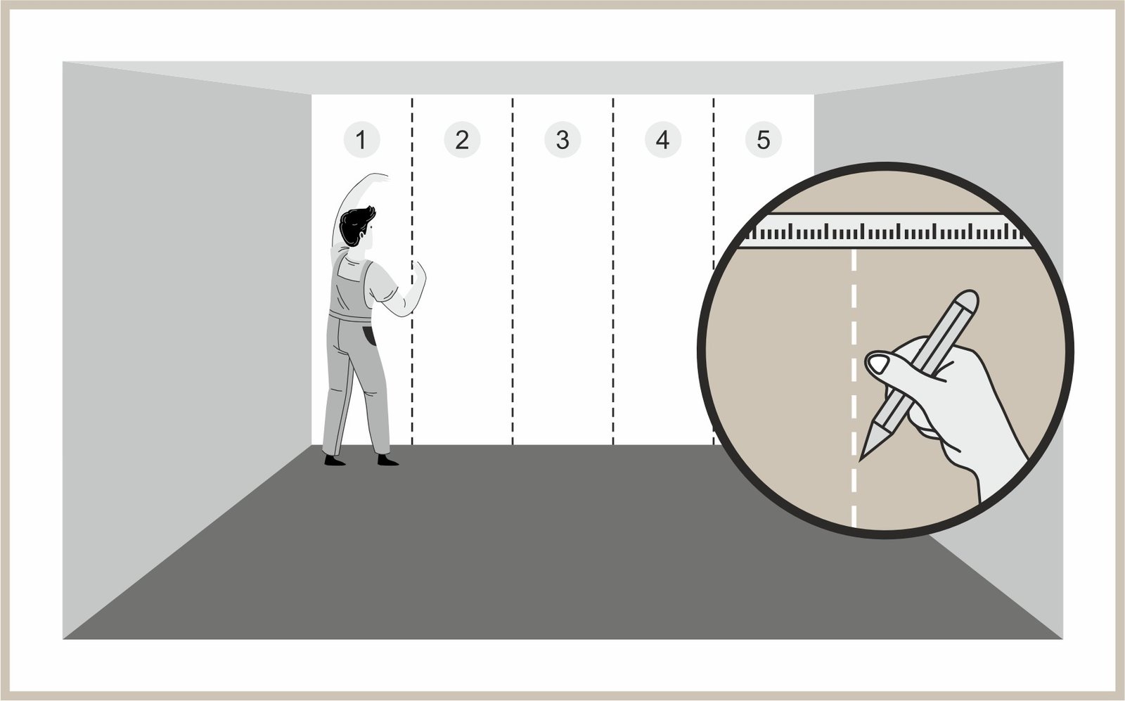 Přesné měření je klíčem k dokonalé instalaci. Pomocí metru, tužky a olovnice si rozdělte stěnu na šířky jednotlivých panelu a svislé čáry jemně tužkou vyznačte.