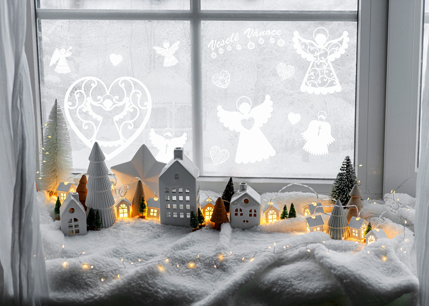 Dekorativní vánoční voděodolné statické okenní fóliové samolepky – jednoduchý a okamžitý způsob, jak do Vašeho domova vnést okouzlující sváteční náladu.