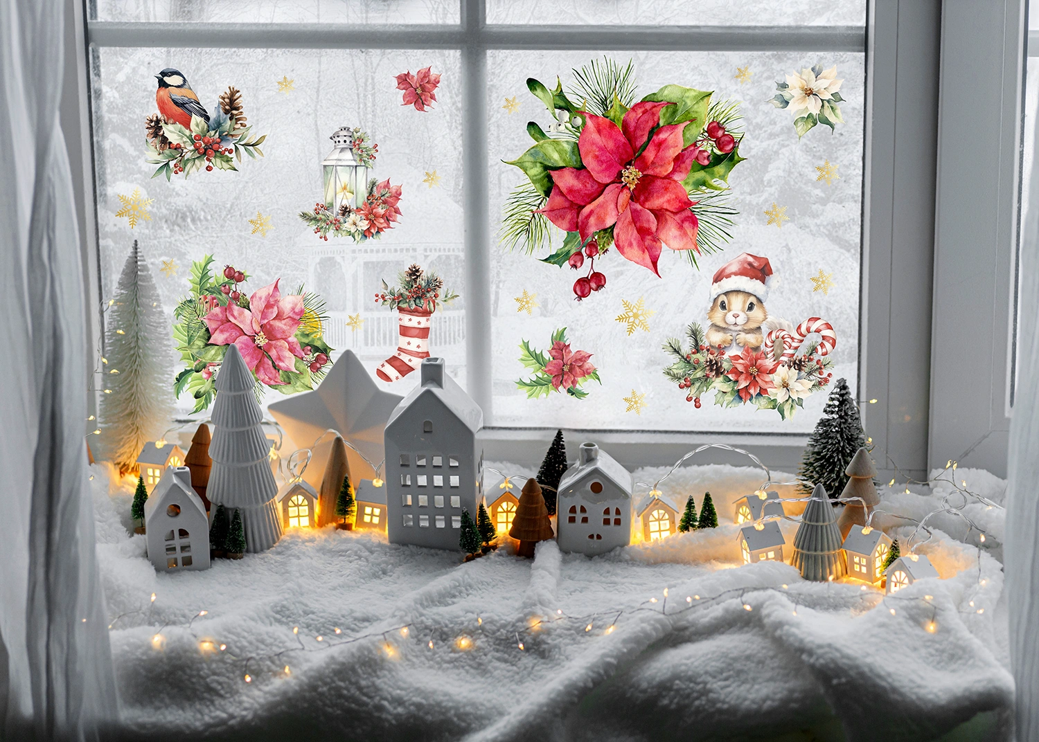 Dekorativní vánoční voděodolné statické okenní fóliové samolepky – jednoduchý a okamžitý způsob, jak do Vašeho domova vnést okouzlující sváteční náladu.